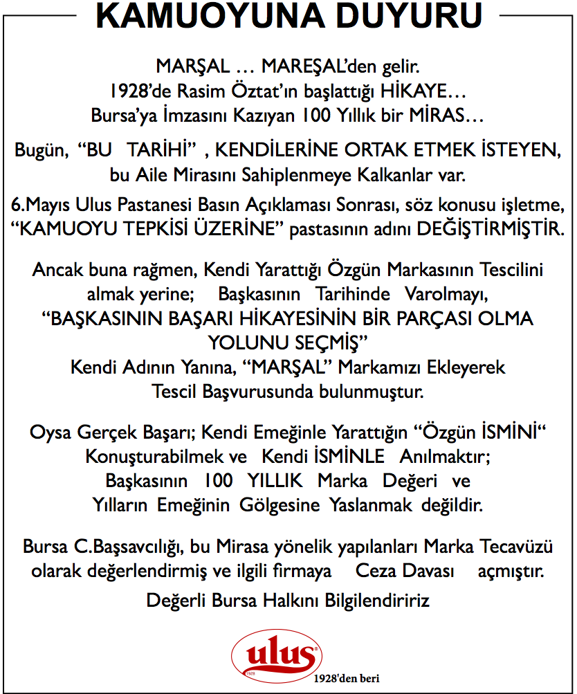 1928’de Rasim Öztat Ulus Pastanesi'ni açtığı yıl, kendi işyerine özel bir lezzet olsun diye, tamamen kendi el becerisiyle bir pasta geliştirmiş ve "4 katlı bir pasta yaptım, üstünden çikolatası akıyor, adeta rütbeden gelen Mareşal'i andırıyor“ diyerek, kendi Özel pastasının adını Mareşal koyar. 2.Dünya Savaşı sonları 1949-1950 yıllarında, Türkiye’ye meşhur Marshall yardımları yapılır ve Rasim Öztat’ın özel pastasının adı halk arasında Marşal'a dönüşür. 1950 yılından beri de Marşal Pasta adı ile Ulus Pastanesi'nce satışa sunulmuştur. O gün bugündür dile kolay 1 Asırdan beri tam 3 kuşaktır üretilip lezzet ve ünü önce Bursa’ya sonra Türkiye’ye Ulus Pastanesi tarafından taşınan Marşal Pasta, Türk Patent Kurumu nezdinde Ulus Pastanesi’ne Ait Tescilli Markadır.
